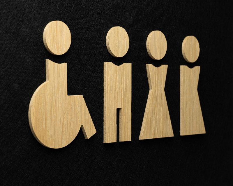Het uitgefreesde picto (man, vrouw, kind, rolstoel) bordje WOOD eik is een 15 cm hoog en 4 mm dik natuurlijk eikenhout. De picto kan men direct op wand of deur plakken. Er zijn in totaal 4 pictogrammen te kiezen.
