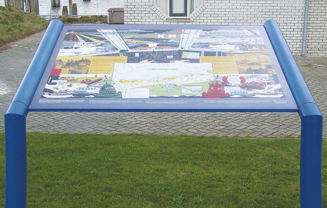 Lessenaar van aluminium (in gewenste RAL-kleur gespoten) met een vast kokerprofiel van 90 mm diameter en 3 mm wanddikte en een f.c. print. Beenlengte is 180 cm en komt daardoor 100 cm boven maaiveld; direct onder maaiveld zijn deze voorzien van een tussenbuis dat zorgt voor een extra versteviging. Gelast onder een hoek van 110 graden. Lengte vanaf gelaste hoek is 80 cm en dat is voorzien van 90 mm rond klapprofiel waardoor u het bord blind bevestigd met anti-diefstal bouten en moeren maar waar u dit later ook weer eenvoudig kunt wisselen. Verder voorzien van een blanco compactplaat van 77x80 x1,5cm (zichtmaat 70x80cm) dat blind wordt bevestigd in klapprofiel. Plaatsing in beton d.m.v. de grondankers. Beton wordt niet meegeleverd. Voorzien van een full-colour print op vinyl en volvlaks voorzien van UV-werend laminaat. Voor de print een drukklaar bestand aanleveren. Indien niet in uw bezit dan kunnen wij deze voor bescheiden vergoeding voor u opmaken. Bij bestelling gewenste RAL-kleur van de aluminium delen vermelden