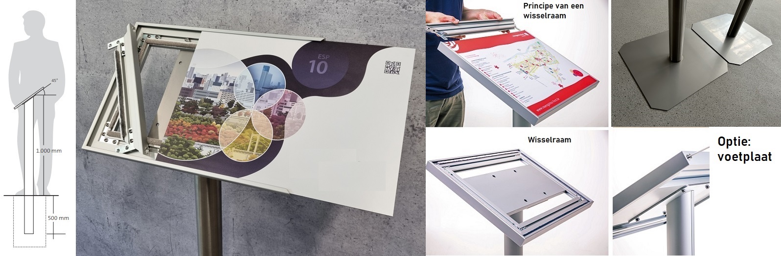 Luxe RVS/INOX parkeer of info lessenaar. De staander is een 150 cm lange RVS/INOX paal met een diameter van 60 mm die aan de bovenkant voorzien is van een plaat met gaten die onder een hoek van 45 graden op de staander gelast is. Op die houder plaats men het meegeleverde wisselraam (liggend of staande uitvoering maar dat dient bij uw bestelling te vermelden). Het wisselraam is van aluminium en is 20 mm dik. In de regel wordt de staander ca. 50 cm in de bodem geplaatst (dit is natuurlijk uw keuze). De paal kan ook voorzien worden van een voetplaat (40x40 cm) voor het vastzetten op een harde ondergrond of voor gebruik indoor. Bij voetplaat die er opgelast wordt, is de staander 50 cm ingekort.Voor levering van een geprint bord is de prijs op aanvraag. Voetplaat voor vrijstaande toepassing of voor vastschroeven aan de ondergrond tegen meerprijs. In het wisselframe past een dibond/alupanel plaat met een dikte van 3 mm. Bij de uitvoeringen met print wordt het compleet geleverd. Bij de uitvoeringen zonder print wordt er geen paneel mee geleverd en dient men daar dan zelf voor te zorgen. De staander met RVS/INOX montageplaat kan ook zonder wisselframe geleverd worden. Men kan er dan direct een los geprint paneel op monteren. Voor de uitvoering met een geprint paneel dient u een drukklaar bestand aan te leveren op basis van het gekozen formaat met rondom 1 cm afloop. Indien niet beschikbaar dan kunnen wij daar tegen meerprijs in voorzien. Ook het plaatsen/monteren van de lessenaar is tegen meerprijs.