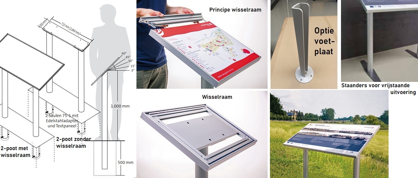 Ideale zilverkleurige of witte (RAL9010) lessenaar voor informatieoverdracht bij o.a. bezienswaardigheden, natuurobjecten of het tonen van plattegronden. Deze 2-poot display wordt geleverd met verschillende formaten wisselframes (overige afmetingen op aanvraag). Het wisselframe is een 60/32 aluminium profiel (32 mm diep) dat aan de bovenkant geopend kan worden waarna men het geprinte paneel eenvoudig kan vervangen (zie tevens de afbeeldingen). De staander van aluminium heeft een diameter van 75 mm en een lengte van 1500 mm (500 mm voor in de grond of beton) en 1000 mm boven maaiveld. De kleur van de staander is evenals het bord of zilverkleurig of wit (bij bestelling keuze kenbaar maken). Het geheel in een gewenste RAL-kleur gespoten is tegen een standaard meerprijs; zie bij opties. De staander kan tegen meerprijs voorzien worden van een voetplaat om de lessenaar op een vaste ondergrond te kunnen schroeven. De staander is voorzien van een RVS/INOX montageplaat waarop het wisselframe gemonteerd wordt. Deze plaat met frame kan men in verschillende hellingshoeken monteren afhankelijk van uw wens. In het wisselframe past een dibond/alupanel plaat met een dikte van 3 mm. Bij de uitvoeringen met print wordt het compleet geleverd bij de uitvoeringen zonder print wordt er geen paneel bij geleverd en dient men daar zelf voor te zorgen. De staander met RVS/INOX montageplaat kan ook zonder wisselframe geleverd worden. Men kan er dan direct een los geprint paneel op monteren. Voor de uitvoering met een geprint paneel dient u een drukklaar bestand aan te leveren op basis van het gekozen formaat met rondom 1 cm afloop. Indien niet beschikbaar dan kunnen wij daar tegen meerprijs in voorzien. Ook plaatsen/monteren van de lessenaar is tegen meerprijs.