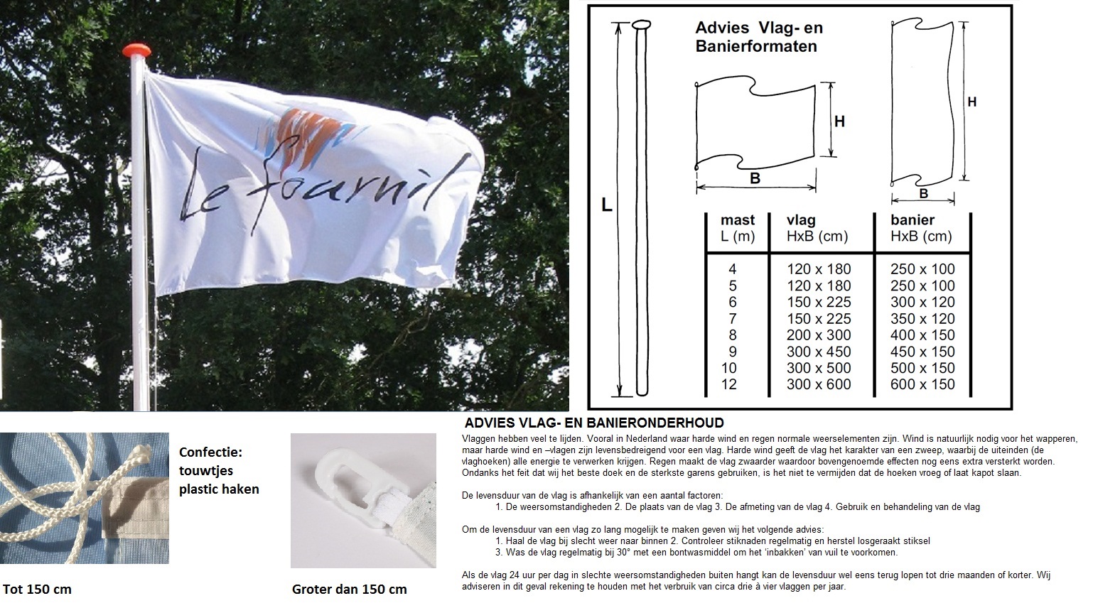 Digitaal druk, UV bestendig, sublimatie 95% doordruk, van 3-draads geweven glanspolyester vlaggendoek, ca. 115 gr. Volledig geconfectioneerd, rondom gezoomd en eventueel aan de mastkant voorzien van kopband en clips. Bij aantallen boven de 100 stuks prijs op aanvraag. Leveringen binnen 5 werkdagen met toeslag. Staat de door u gewenste afmetingen er niet bij dan is het prijs op aanvraag. Printklaar PDF-bestand aanleveren op basis van de afmetingen van de vlag. Deze kunnen wij tegen meerprijs ook voor u opmaken.